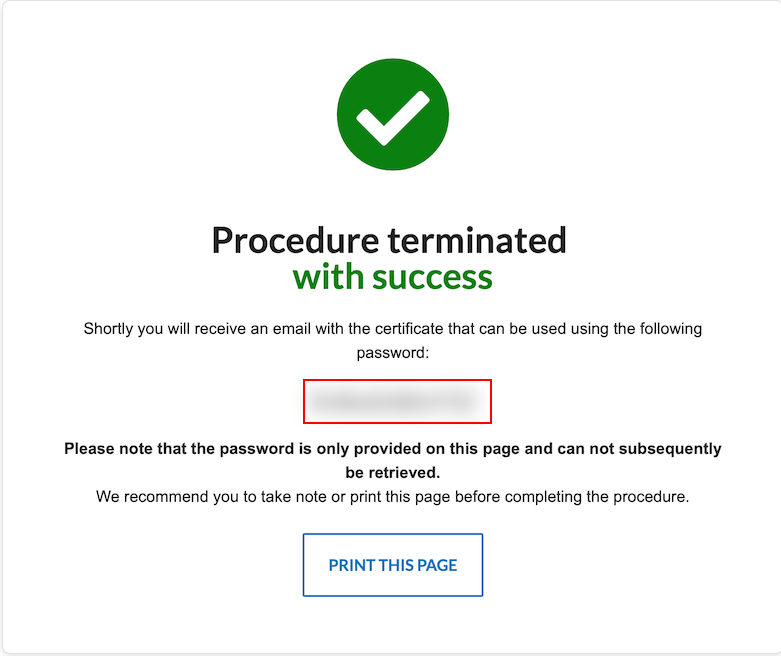 問題なければ、Procedure terminated with successの画面になるので、キーチェーンに登録する際に必要になるので表示されたパスワードを忘れずに保存しておくこと。