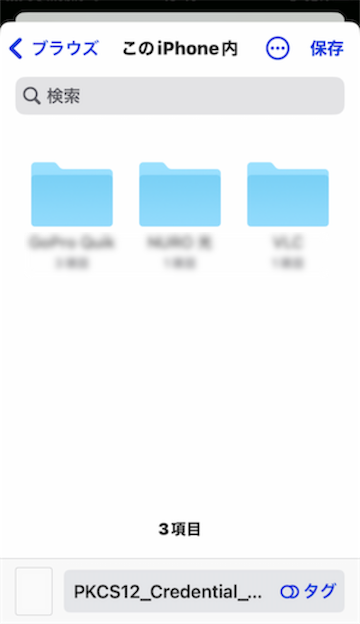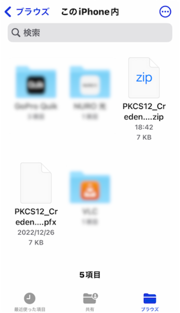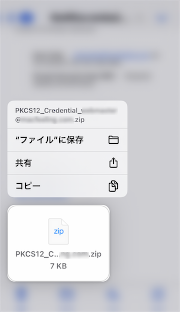 「ファイル」アプリを起動して、保存した「PKCS12_Credential_登録したメールアドレス.zip」ファイルをタップして解凍すると、「PKCS12_Credential_登録したメールアドレス.pfx」というファイルが作成されます。