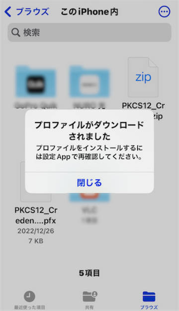 「PKCS12_Credential_登録したメールアドレス.pfx」ファイルををタップすると、「プロファイルがダウンロードされました。プロファイルをインストールするには、設定 Appで再確認してください。」というダイアログが表示されます。「閉じる」をタップしてください。
