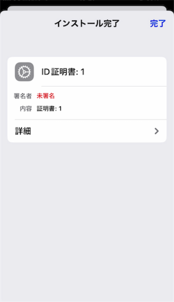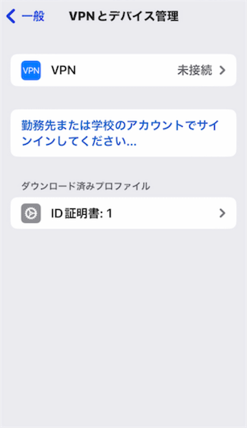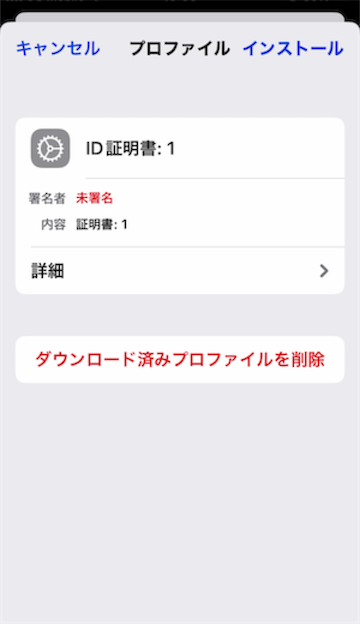 「設定」»「一般」»「情報」»「VPNとデバイス管理」を開き、ダウンロード済みのプロファイルにて、該当するもの(ID証明書)をタップ、問題なければ右上の「インストール」をタップ。