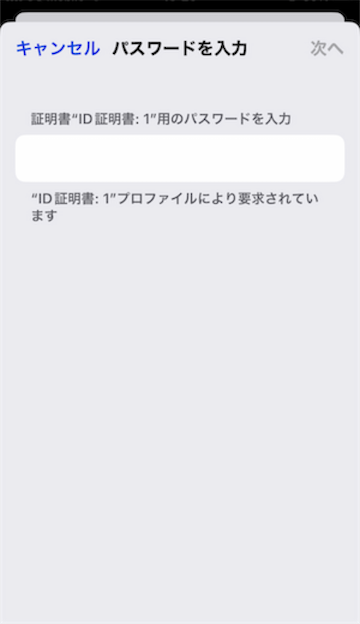 証明書のパスワードを入力するように促されたら、Procedure terminated with successの画面で表示されたパスワードを入力して、右上の「次へ」をタップ。最後に右上の「完了」をタップ。