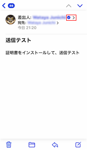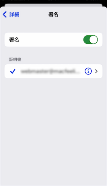 メールを送信する前に、iPhoneの「設定」»「メール」»「アカウント」»「証明書を取得したメールアドレス」»「アカウント」»「詳細S/MIME. 署名」»「メール」にて、署名を有効にしてください。