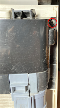 赤四角部分のツメを上方向に押さえて、ホコリセンサーのカバーを外し、ホコリセンサーを引き出します。