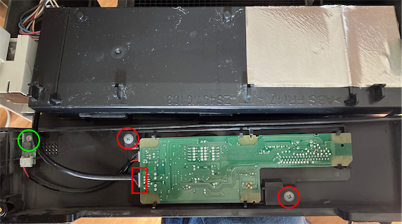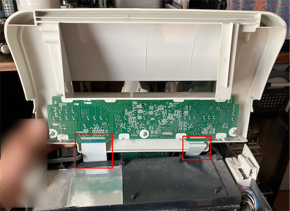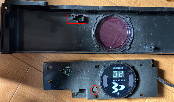 上記画像、赤丸部分の2箇所のネジを外して、表示プリント基盤のユニットごと外します。