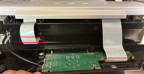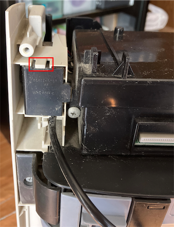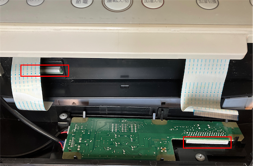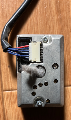 赤四角の部分のコネクターを水平に引っ張ってホコリセンサー用のケーブルを外します。