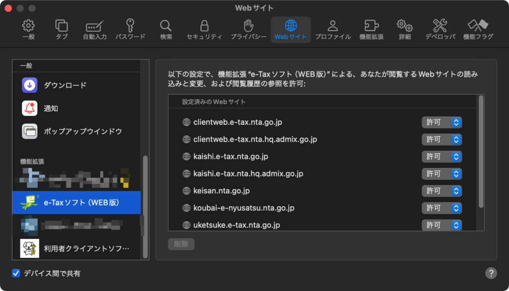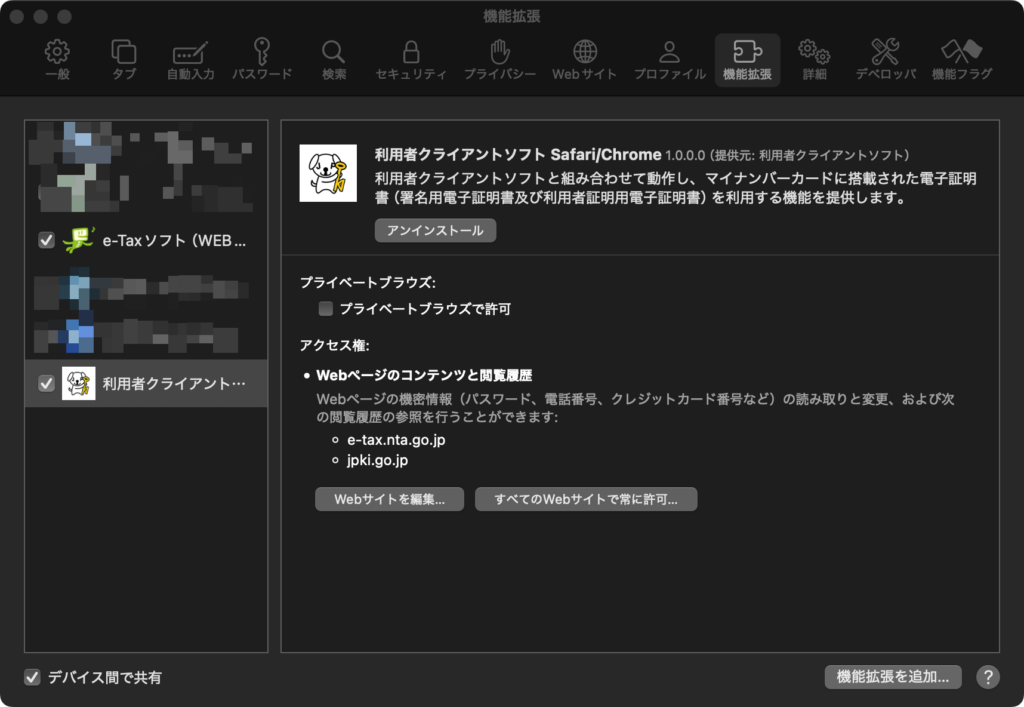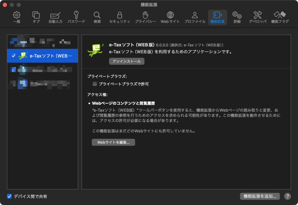 Safariを起動して、「設定」「機能拡張」にて「e-Taxソフト(WEB版)」にチェックを入れる。