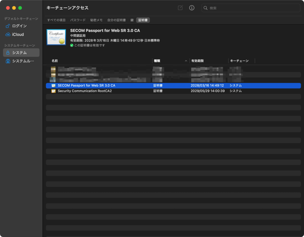 システム を選択し、「ファイル」メニュー »「読み込む…」 で、「Application」フォルダ »「eTax」フォルダ内の「scrootca2. der」ファイルを選択