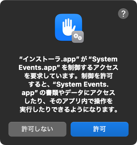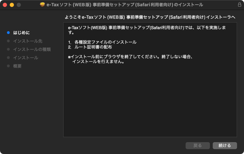 Safariを終了しているのを確認したら、ダウンロードした「eTaxMac.dmg」をダブルクリック。中の「eTaxInstall.pkg」をダブルクリックしてインストールをしてください。System Eventsへのアクセス許可を要求されたら許可してください。