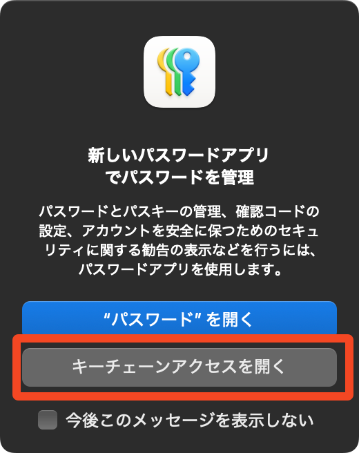 どちらを開くか聞かれたら、「キーチェーンアクセスを開く」を選択。