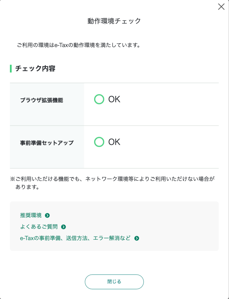 環境チェック結果のウインドウが開くので、問題なければ以下のような感じになります。