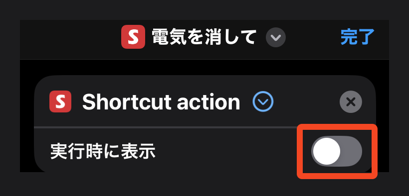 ショートカット実行後の表示が邪魔な場合は、ショートカットの右上「…」をタップ、次の画面でShortcut actionの右の矢印をタップ、「実行時に表示」をオフにして下さい。