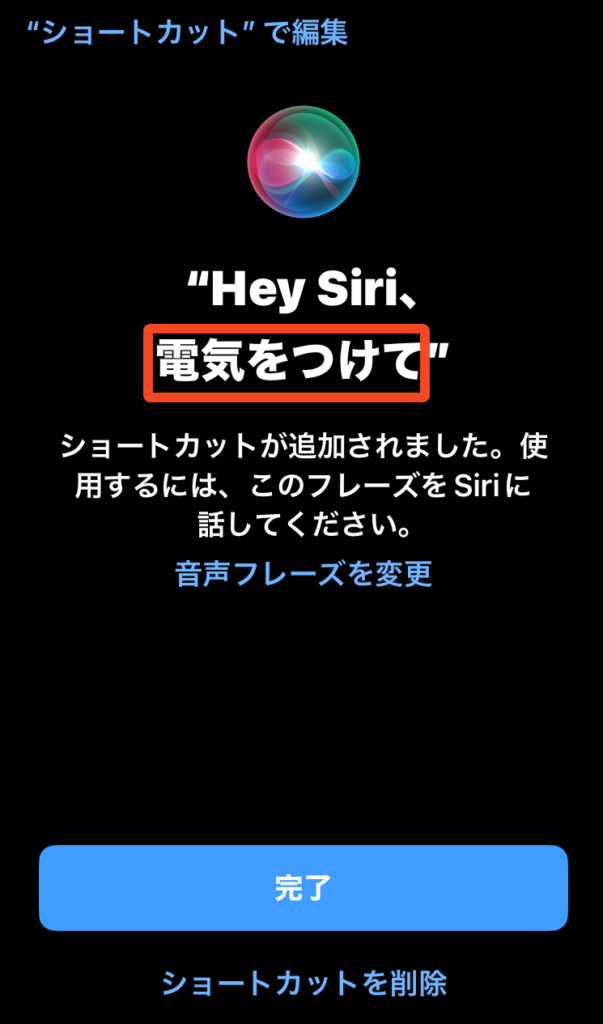 後は、Siriを呼び出して、フレーズを話せば、指定したコマンドが実行されます。