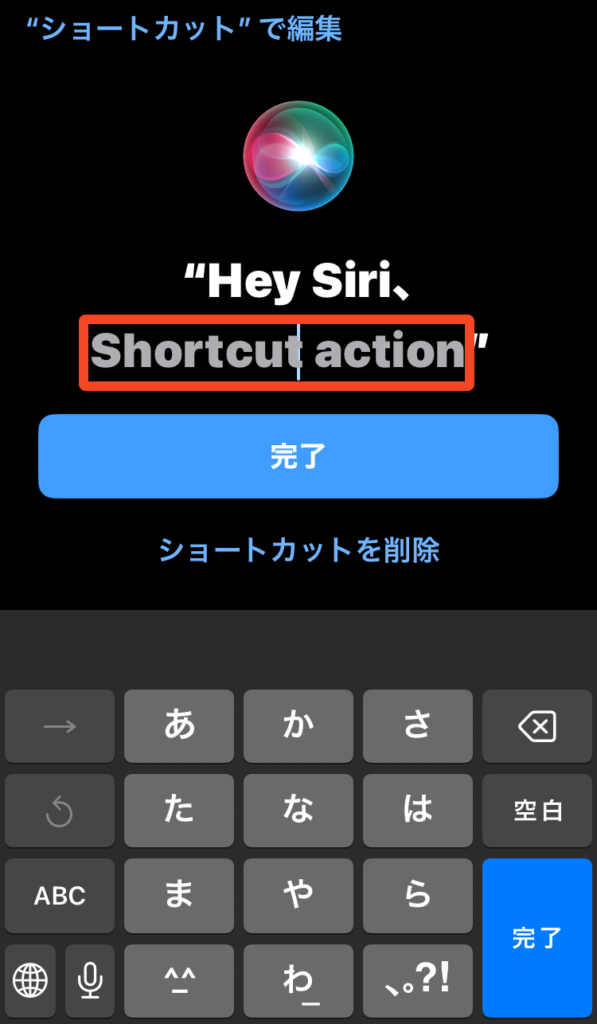 ”Shortcut action”の部分をタップして、Siriで命令するフレーズを入力してください。
