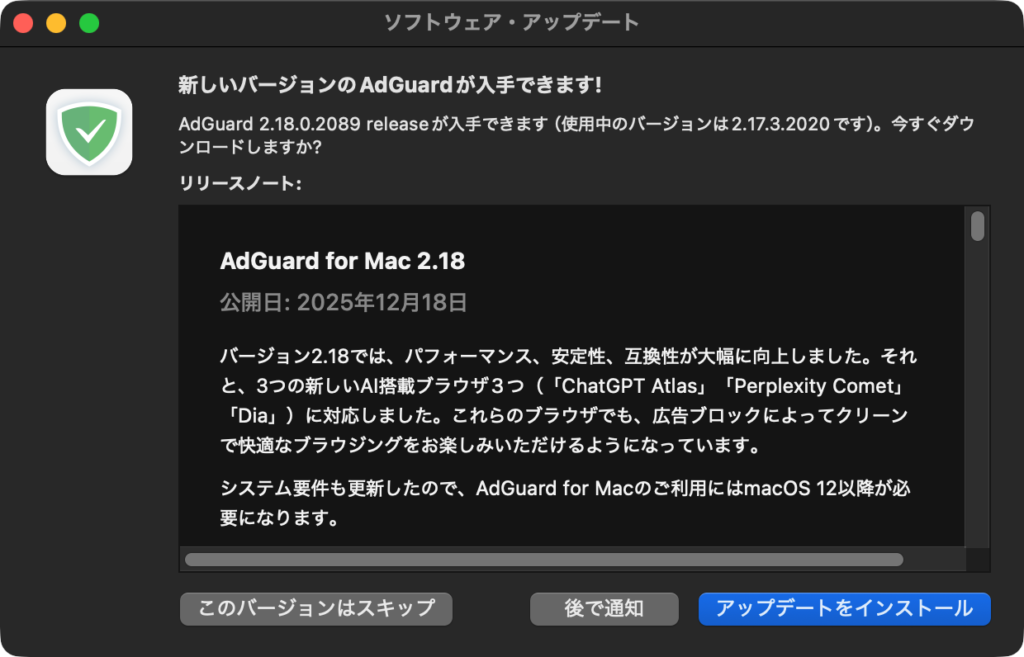 AdGuard for Mac v2.18: 3つのAI搭載ブラウザ(ChatGPT、 Perplexity、Dia)に対応