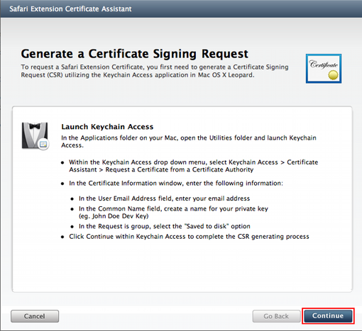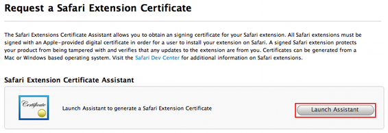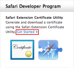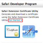 Safari Dev Center – Apple Developerのページにログインしたら、ページ右側の「Safari Extension Certificate Utility」より「Get Started」のリンクをクリック