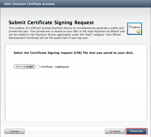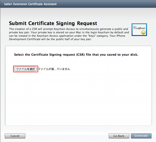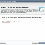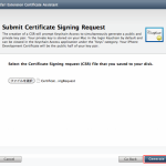 「ファイルを選択」ボタンをクリックして、保存した「CertificateSigningRequest.certSigningRequest」ファイルを選択