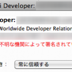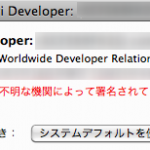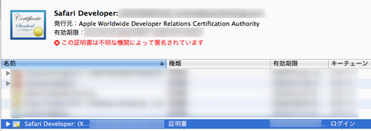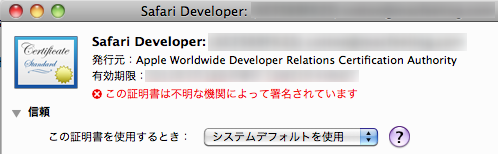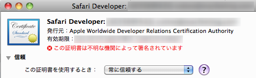 なおリストより「Safari Developer」を選択すると、「この証明書は不明な機関によって署名されています。」と表示されます。