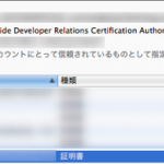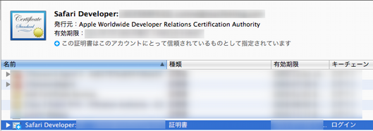 最後に「safari_identity.cer」ファイルをダブルクリックすると、キーチェーンに登録(分類 » 証明書でリストに「Safari Developer」)されます。